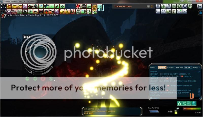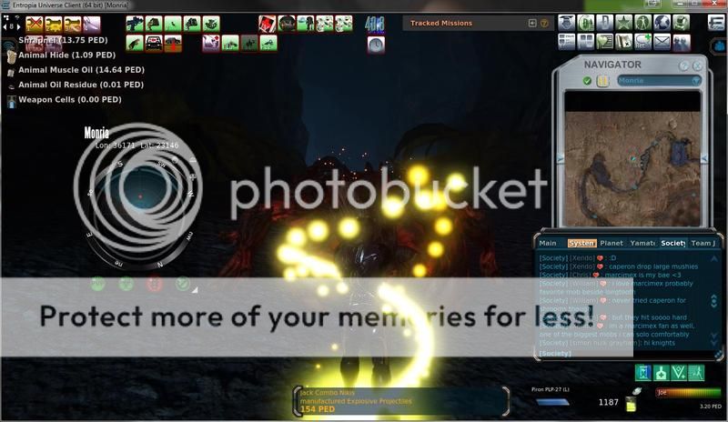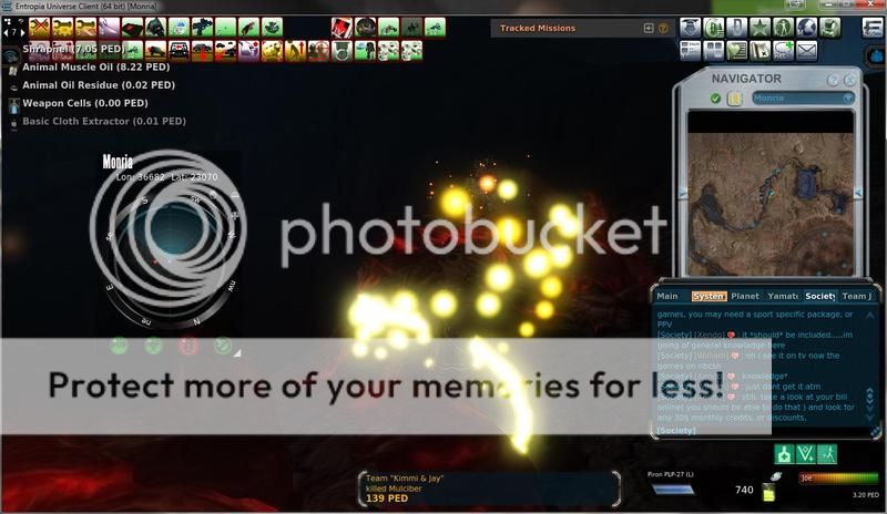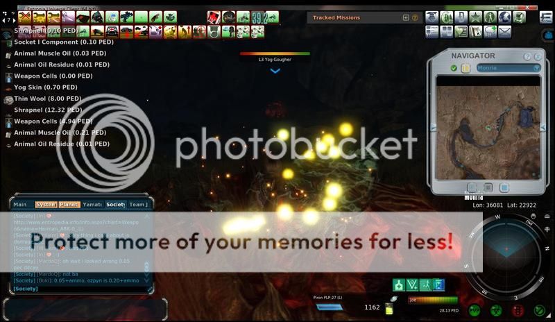 Ok, So I'm back, I finally got to put some money in to take care of things, went out hunting and mining (IE: Munting) and low and behold... only had a like 4 hits out of like 90 peds worth of probes, three of em were reasonably decent a size X Lyst, a size IX Quant and a size VIII Crude oil..., that size X is the biggest I think I've EVER gotten, mining.