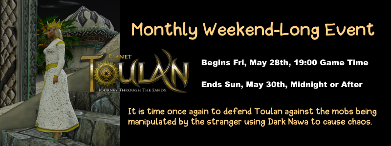 Location | Begins at Guardian Village with HM Queen Nara and will expand across various locations on Toulan over the weekend