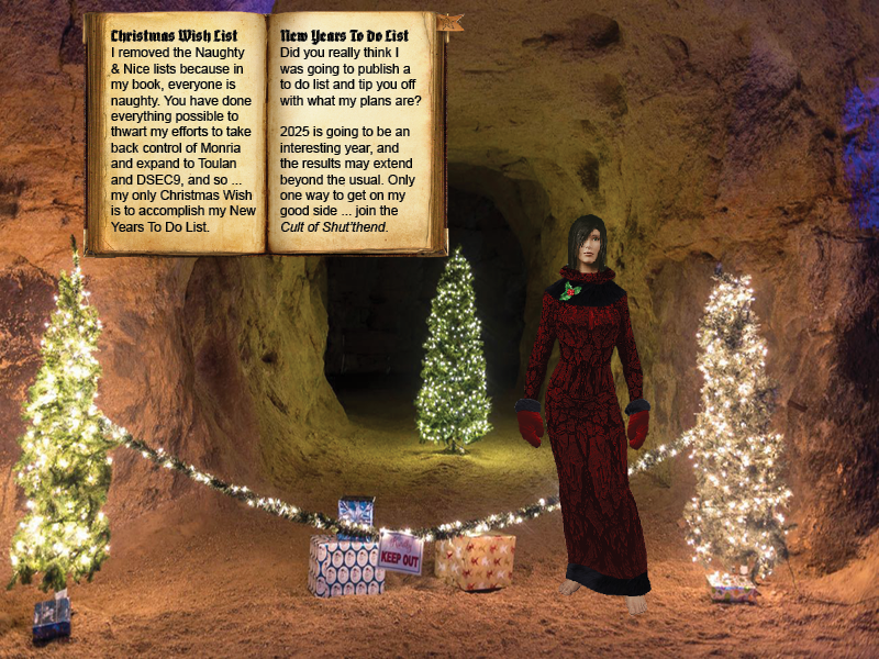 Well, we learned with the Monria event that we basically got pranked by Decca because her Christmas Wish List that Goth found in the cave was fake because she knew there was a mole in her Cultist ranks, but Goth got a photo of her journal pages with her true message that also told us that she knew those would be discovered as well, so ... seems we're back at square one because she's not letting on to any of her plans ... doesn't surprise me though and we're still in the dark.